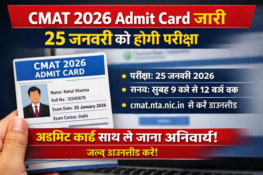 नई दिल्ली: नेशनल टेस्टिंग एजेंसी (NTA) ने कॉमन मैनेजमेंट एडमिशन टेस्ट (CMAT) 2026 का एडमिट कार्ड जारी कर दिया है। परीक्षा के लिए पंजीकृत उम्मीदवार अब आधिकारिक वेबसाइट cmat.nta.nic.in पर जाकर अपना हॉल टिकट डाउनलोड कर सकते हैं।